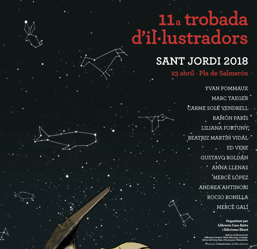 En Barcelona, participará el día de Sant Jordi, 23/4, en la Trobada d’Ilustradors donde firmará ejemplares de sus obras recientemente publicadas: NOSOTROS, NUESTRA HISTORIA (Juventud), CÉLEBRES CASOS DEL DETECTIVE CHATTERTON (Ekaré) y TESEO (Corimbo) y el día 24/4 en una charla con otros ilustradores dirigida a profesionales (escritores, ilustradores, bibliotecarios, libreros y blogueros).